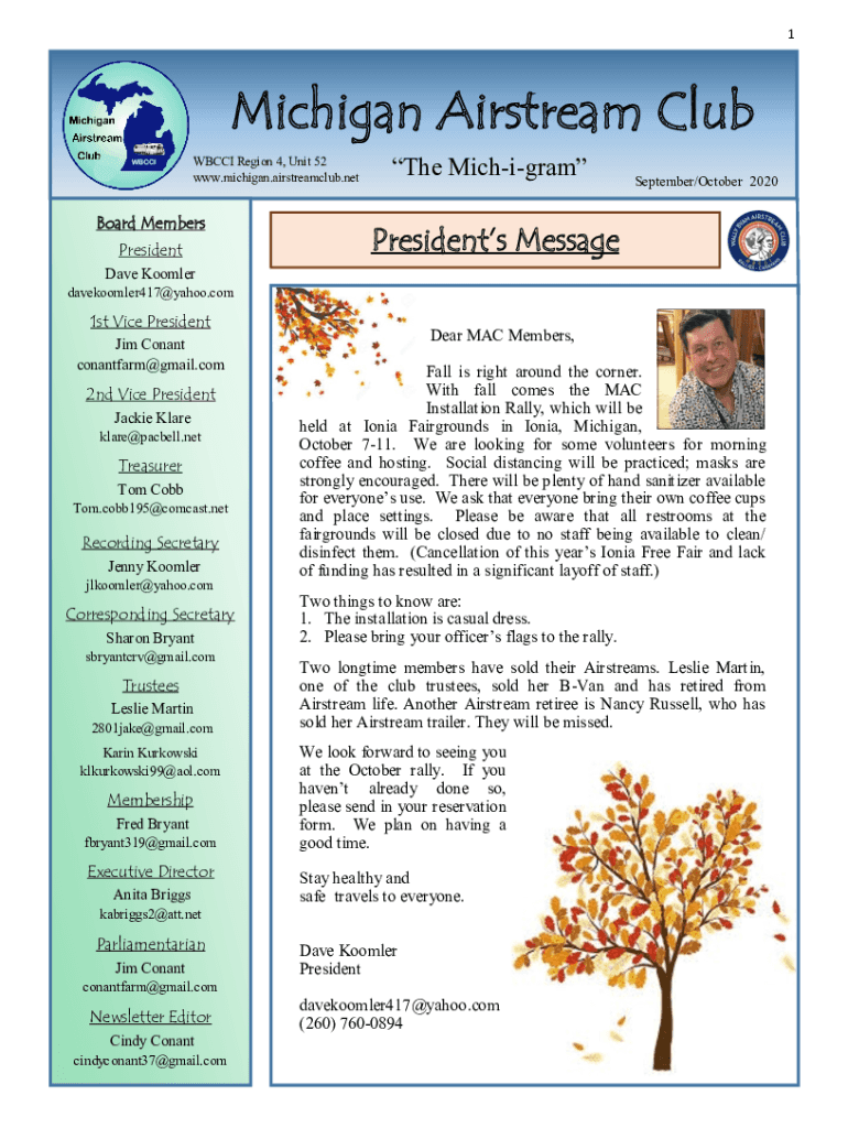 1Michigan Air stream Club WBCCIWBCCI Region 4, Unit 52 www.michigan.airstreamclub.netBoard Members President MichigramSeptember/October 2020Presidents Message Dave Cooler davekoomler417@yahoo.com1st