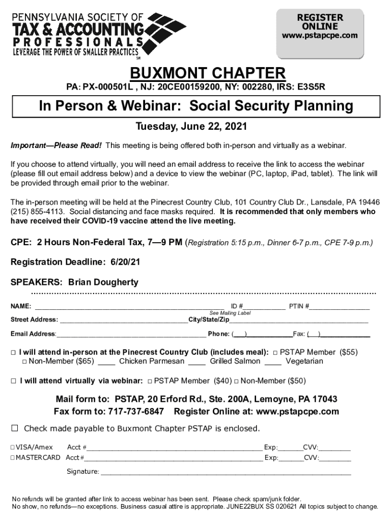 REGISTER Online.stance.comBUXMONT CHAPTER PA: PX000501L, NJ: 20CE00159200, NY: 002280, IRS: E3S5RIn Person & Webinar: Social Security Planning Tuesday, June 22, 2021, ImportantPlease Read! This meeting