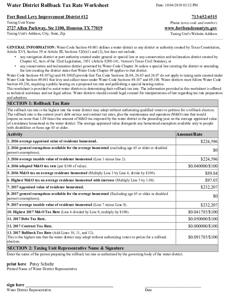 Water District Rollback Tax Rate WorksheetDate: 10/04/2019 03:32 Effort Bend Levy Improvement District #127136526515Taxing Unit Telephone (area code and number)2727 Allen Parkway, Ste 1100, Houston