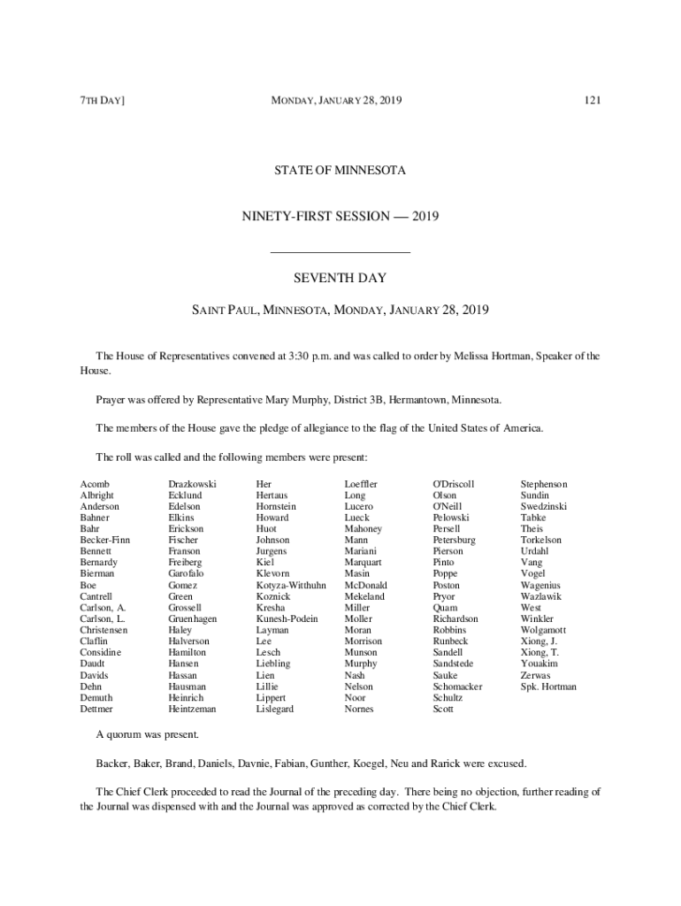 7TH DAY]MONDAY, JANUARY 28, 2019121STATE OF MINNESOTANINETYFIRST SESSION 2019 ___ SEVENTH DAY SAINT PAUL, MINNESOTA, MONDAY, JANUARY 28, 2019The House of Representatives convened at 3:30 p.m. and