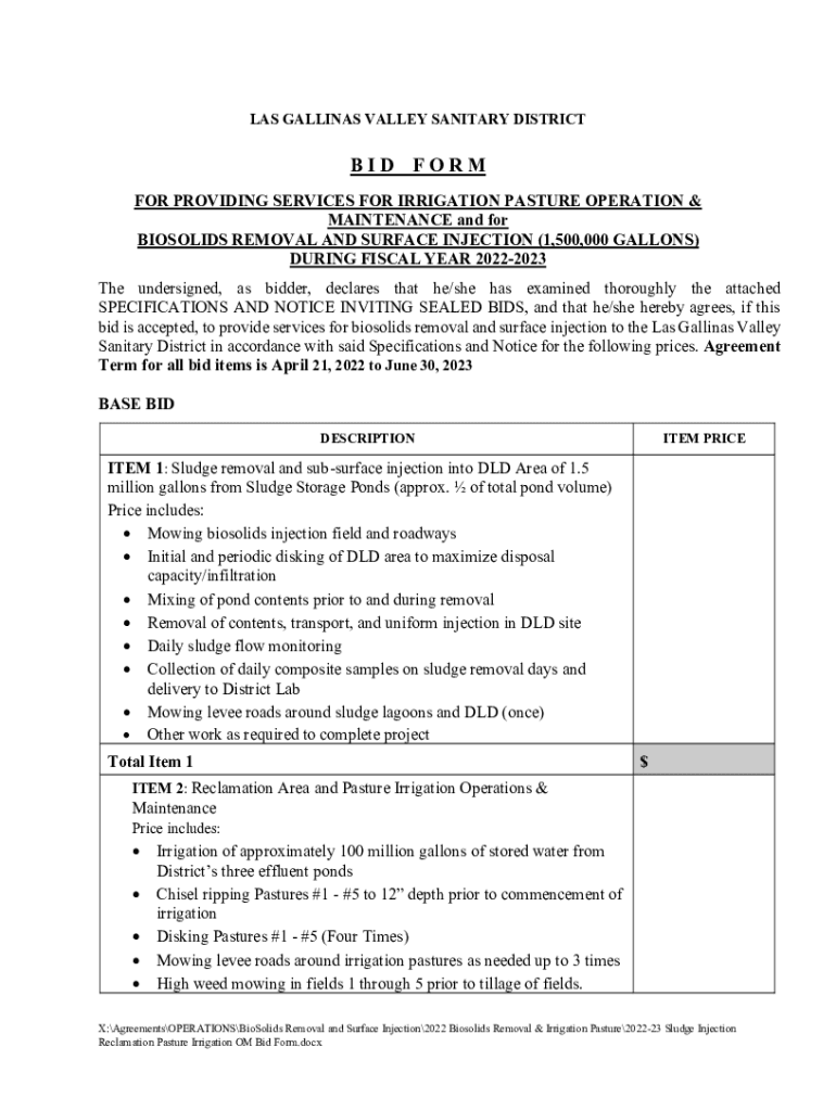 LAS GALLONS VALLEY SANITARY DISTRICT BID Forms FOR PROVIDING SERVICES FOR IRRIGATION PASTURE OPERATION & MAINTENANCE and for SOLIDS REMOVAL AND SURFACE INJECTION (1,500,000 GALLONS) DURING FISCAL