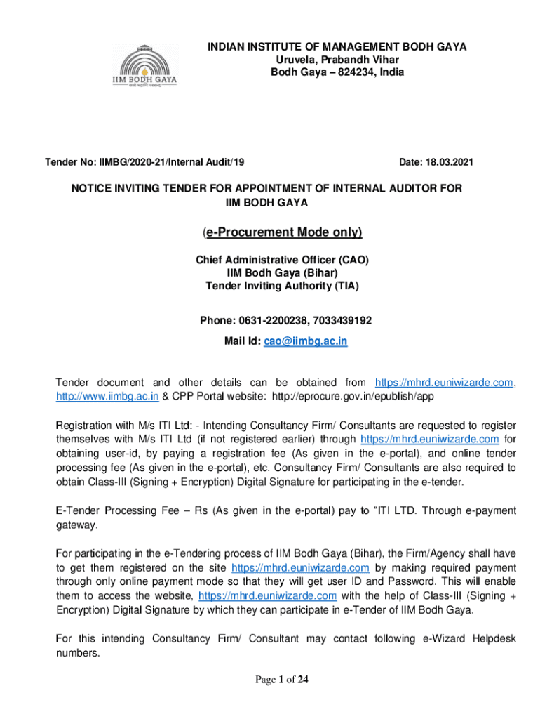 INDIAN INSTITUTE OF MANAGEMENT BOTH MAYA Travel, Armband Vicar Both Maya 824234, IndiaTender No: LIMB/202021/Internal Audit/19Date: 18.03.2021NOTICE INVITING TENDER FOR APPOINTMENT OF INTERNAL AUDITOR