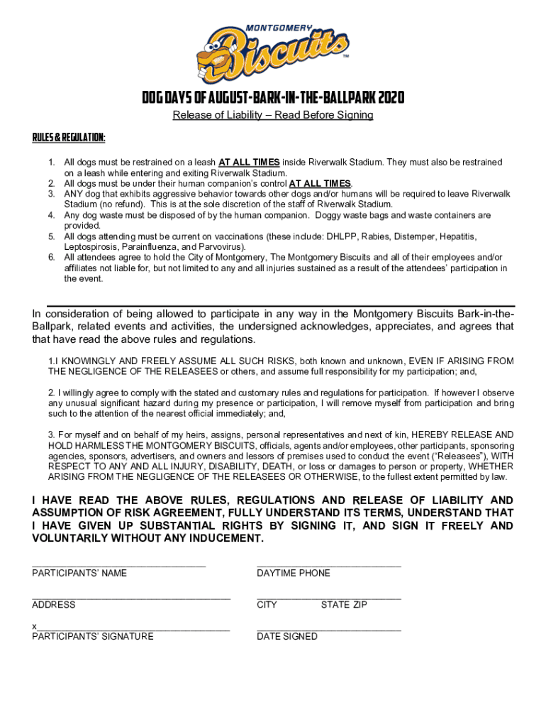 Dog days of AugustBarkintheBallpark 2020 Release of Liability Read Before Signing Rules & Regulation: 1. All dogs must be restrained on a leash AT ALL TIMES inside River walk Stadium. They must also