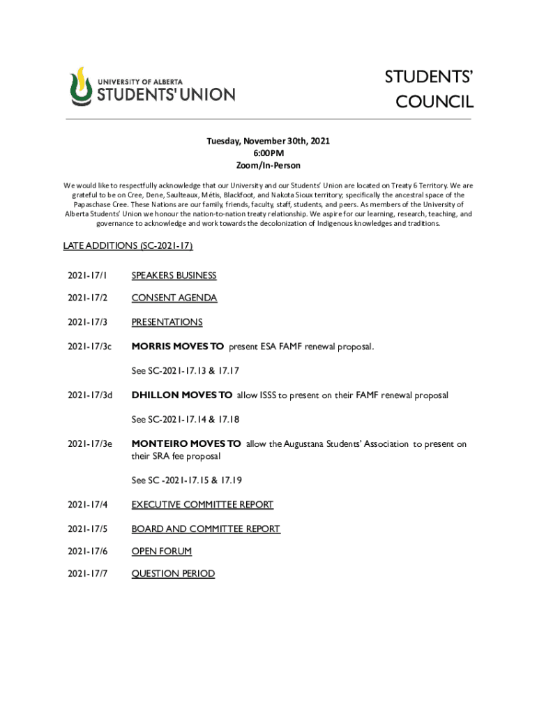 STUDENTS COUNCIL Tuesday, November 30th, 2021 6:00PM Zoom/Unperson We would like to respectfully acknowledge that our University and our Students Union are located on Treaty 6 Territory. We are grateful