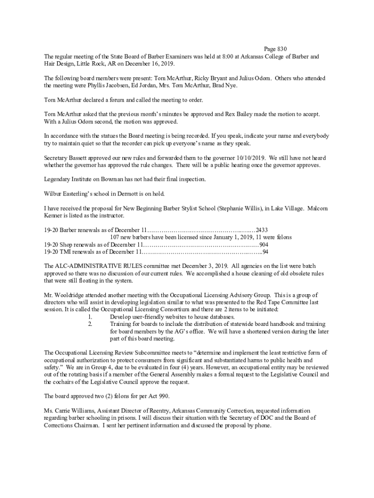 Page 830 The regular meeting of the State Board of Barber Examiners was held at 8:00 at Arkansas College of Barber and Hair Design, Little Rock, AR on December 16, 2019. The following board members