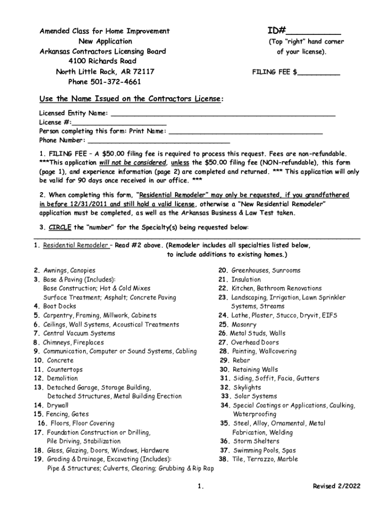 ID#___Amended Class for Home Improvement New Application Arkansas Contractors Licensing Board 4100 Richards Road North Little Rock, AR 72117 Phone 5013724661(Top right-hand corner of your license).