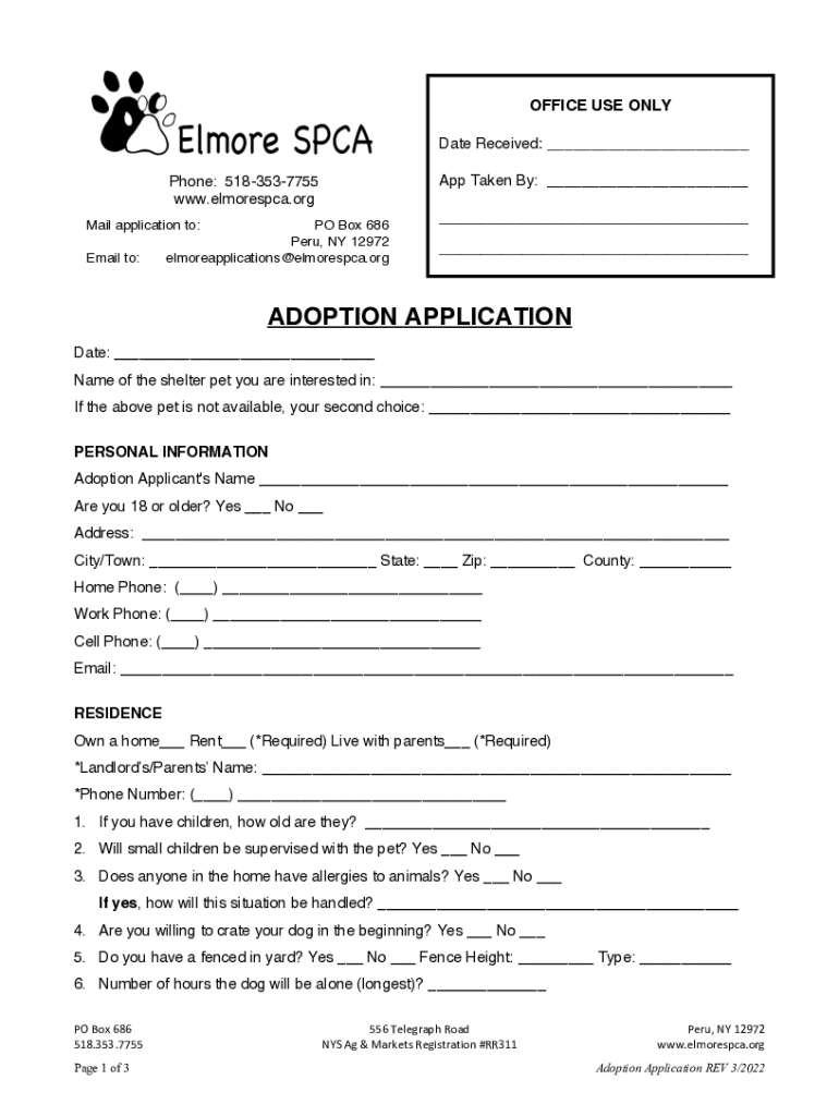 OFFICE USE ONLY Date Received: ___ App Taken By: ___Phone: 5183537755 www.elmorespca.org Mail application to: Email to:PO Box 686 Peru, NY 12972 elmoreapplications@elmorespca.org___ ___ADOPTION APPLICATION