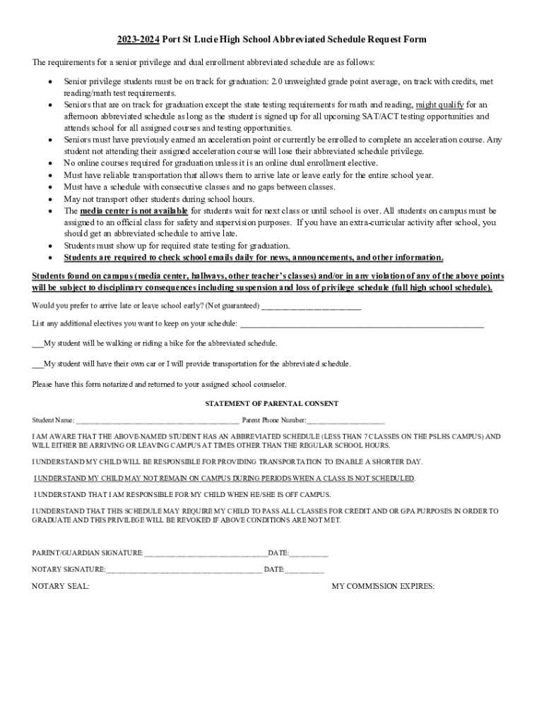 20232024 Port St Lucie High School Abbreviated Schedule Request Form The requirements for a senior privilege and dual enrollment abbreviated schedule are as follows: Senior privilege students must