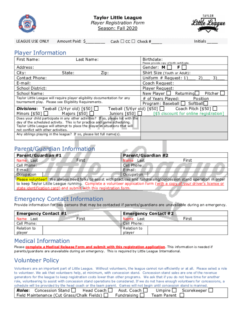 Taylor Little League Player Registration Form Season: Fall 2020 LEAGUE USE ONLYAmount Paid: $___Cash CC Check #___Initials ___Player Information First Name:Last Name:Birthdate: Please provide copy