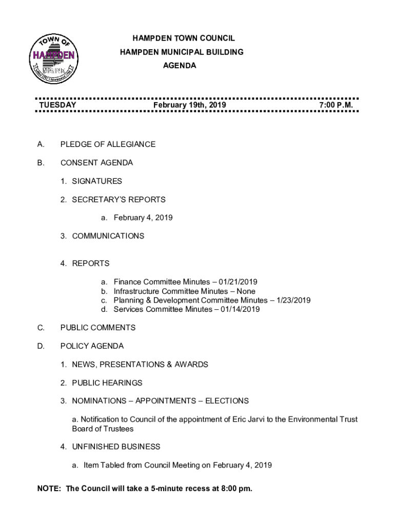 HAMDEN TOWN COUNCIL HAMDEN MUNICIPAL BUILDING AGENDATUESDAYFebruary 19th, 2019A.PLEDGE OF ALLEGIANCE.CONSENT AGENDA7:00 P.M.1. SIGNATURES 2. SECRETARY REPORTS a. February 4, 2019 3. COMMUNICATIONS