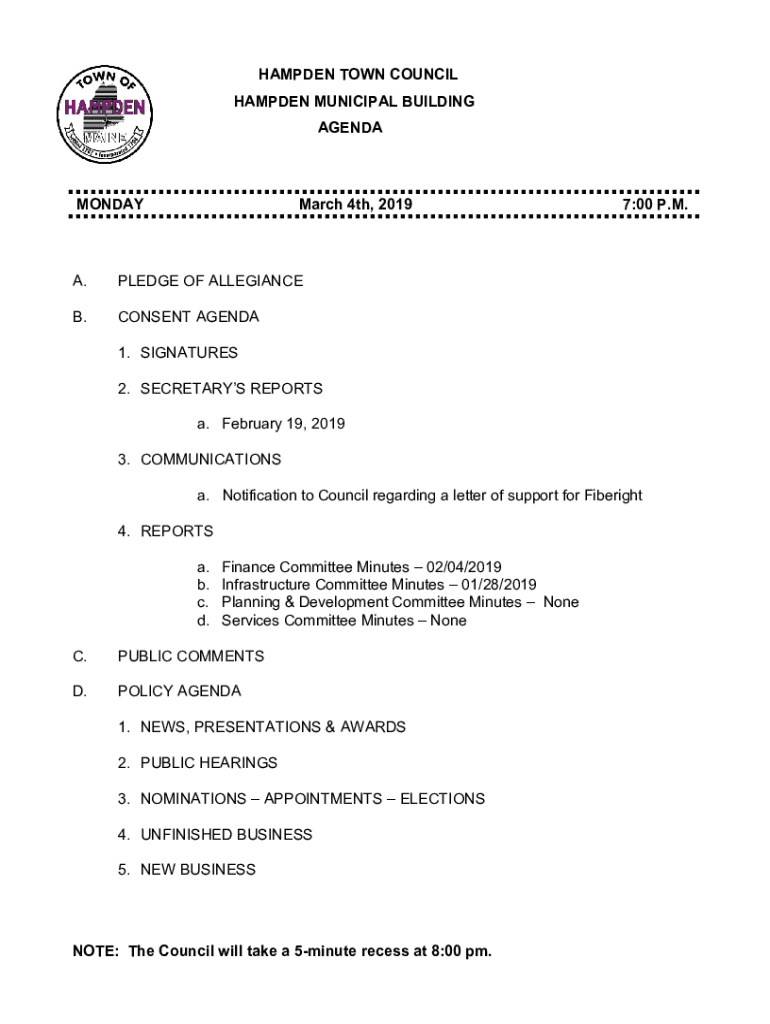 AGENDAMONDAYMarch 4th, 2019A.PLEDGE OF ALLEGIANCE.CONSENT AGENDA7:00 P.M.1. SIGNATURES