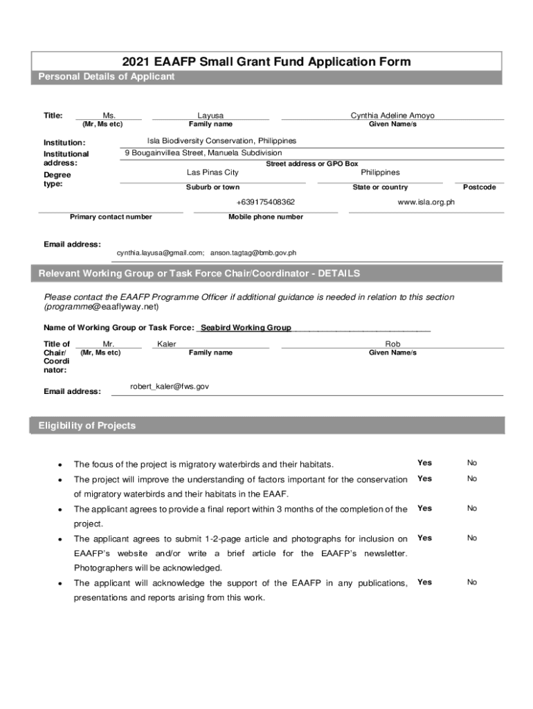 2021 EAA FP Small Grant Fund Application Form Personal Details of ApplicantTitle:Ms. (Mr, Ms etc)LayusaCynthia Adeline AmoyoFamily caregiver Name/sisal Biodiversity Conservation, PhilippinesInstitution:9