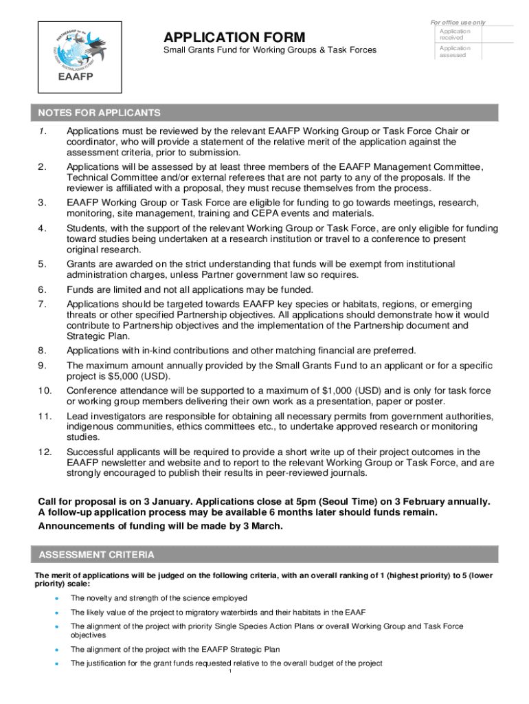 APPLICATION FORM Small Grants Fund for Working Groups & Task Forces office use only Application received Application assessedNOTES FOR APPLICANTS 1. Applications must be reviewed by the relevant EAA