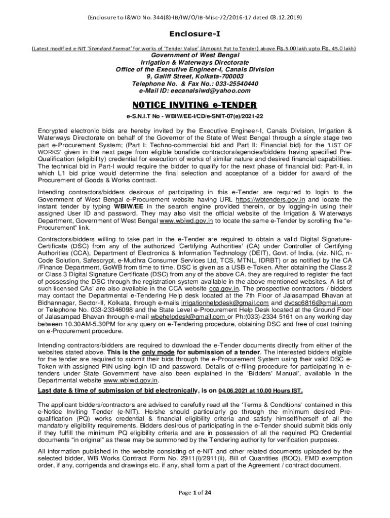 (Enclosure to IOWA No. 344(8)IB/IN/O/IBMisc72/201617 dated 03.12.2019)Enclosure (Latest modified ENIT Standard Format for works of Tender Value (Amount Put to Tender) above Rs.5.00 lakh unto Rs. 45.0