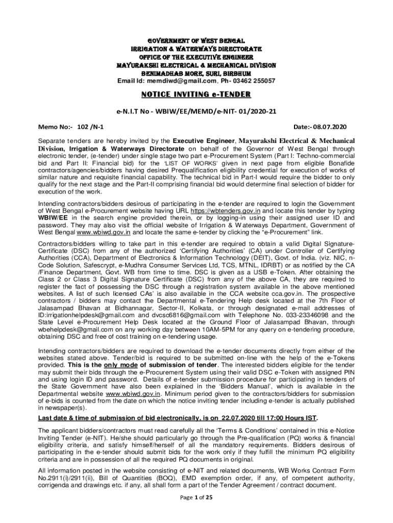 Get the free NOTICE INVITING e-TENDER e-N.I.T No - wbiwd gov