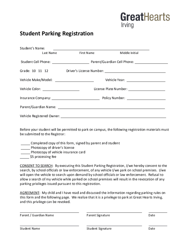 Student Parking Registration Students Name:___Last NameFirst NameMiddle InitialStudent Cell Phone: ___ Parent/Guardian Cell Phone: ___ Grade: 10 11 12Drivers License Number: ___Vehicle Make/Model: