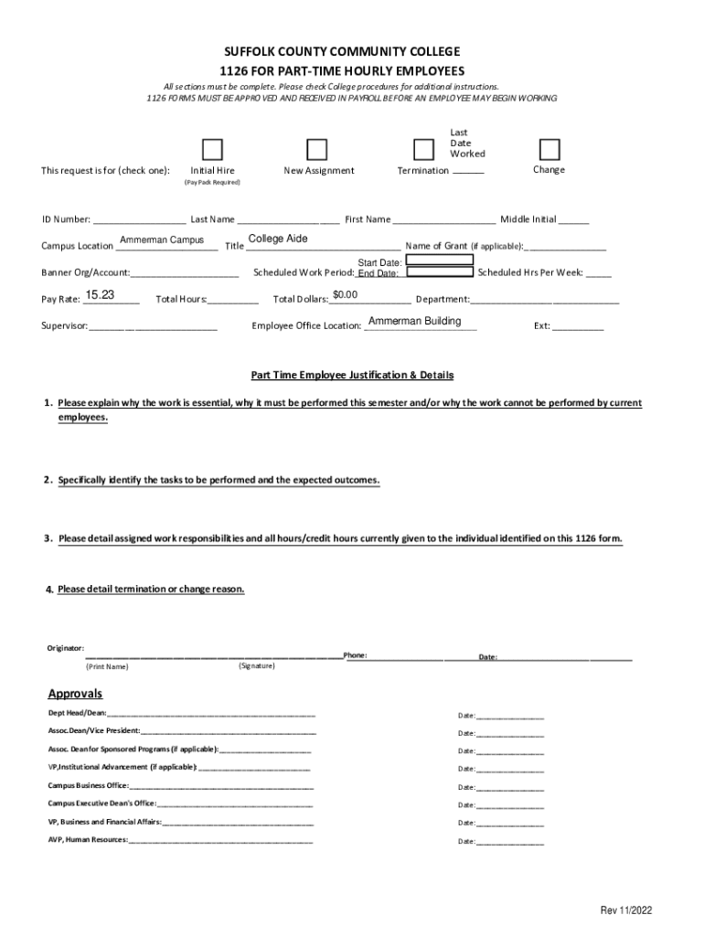SUFFOLK COUNTY COMMUNITY COLLEGE 1126 FOR PART TIME HOURLY EMPLOYEES All sections must be complete. Please check College procedures for additional instructions. 1126 FORMS MUST BE APPROVED AND RECEIVED