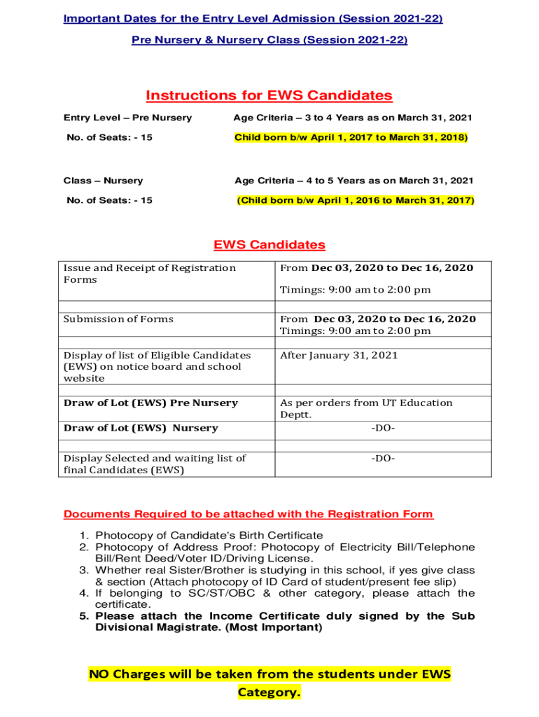 Important Dates for the Entry Level Admission (Session 202122) PRE Nursery & Nursery Class (Session 202122)Instructions for EWS Candidates Entry Level PRE Nursery Criteria 3 to 4 Years as on March