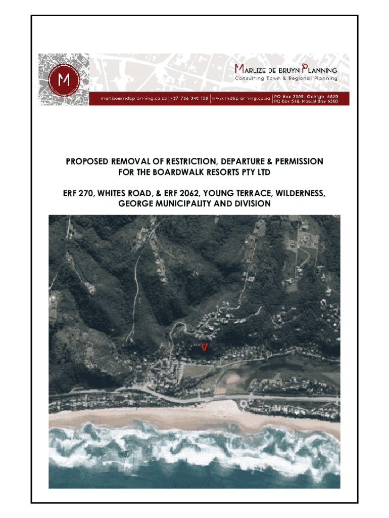 PROPOSED REMOVAL OF RESTRICTION, DEPARTURE & PERMISSION FOR THE BOARDWALK RESORTS PTY LTD ERF 270, WHITES ROAD, & ERF 2062, YOUNG TERRACE, WILDERNESS, GEORGE MUNICIPALITY AND Division 270 & 2062 Wilderness,