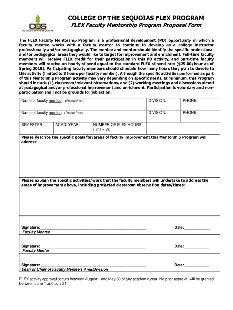 COLLEGE OF THE SEQUOIAS FLEX PROGRAM FLEX Faculty Mentorship Program Proposal Forth FLEX Faculty Mentorship Program is a professional development (PD) opportunity in which a faculty mentee works with