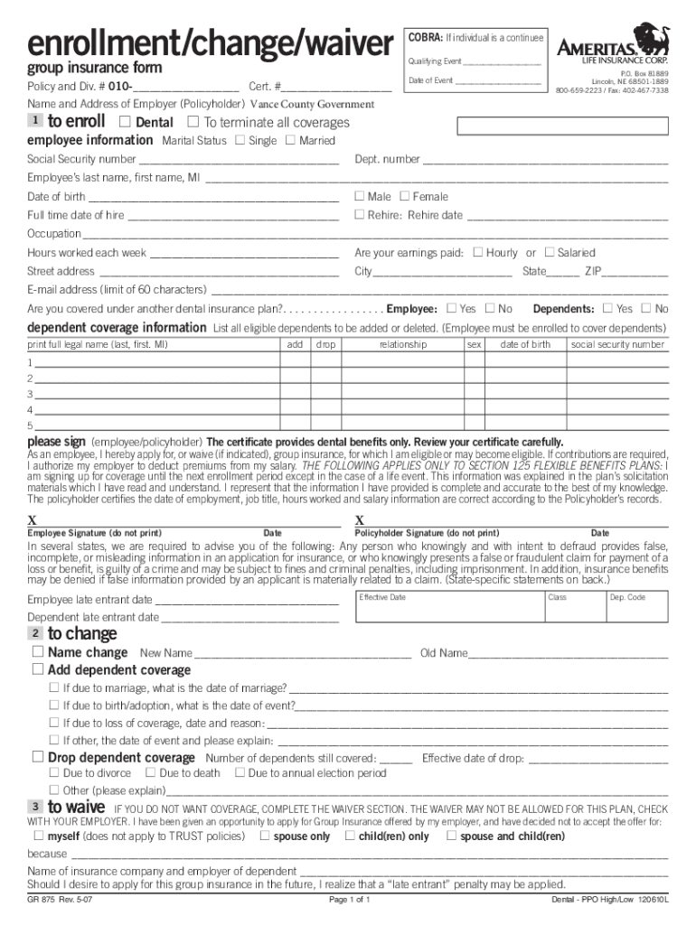 Enrollment/change/waiver group insurance form Policy and Div. # 010 ___ Cert. #___ Name and Address of Employer (Policyholder) Vance County GovernmentCOBRA: If individual is a continued Qualifying