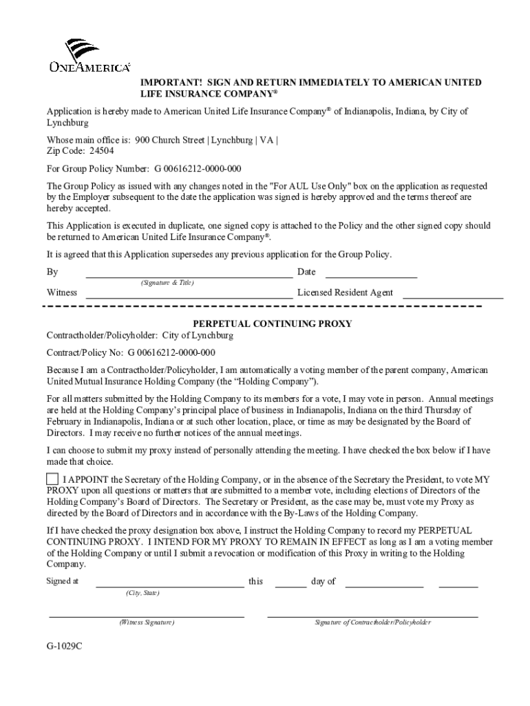 IMPORTANT! SIGN AND RETURN IMMEDIATELY TO AMERICAN UNITED LIFE INSURANCE COMPANY Application is hereby made to American United Life Insurance Company of Indianapolis, Indiana, by City of Lynchburg