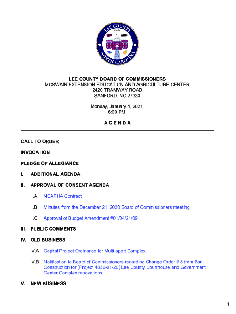 LEE COUNTY BOARD OF COMMISSIONERS McSwain EXTENSION EDUCATION AND AGRICULTURE CENTER 2420 TRAMWAY ROAD SANFORD, NC 27330 Monday, January 4, 2021 6:00 PM AGENDACALL TO ORDER INVOCATION PLEDGE OF ALLEGIANCE