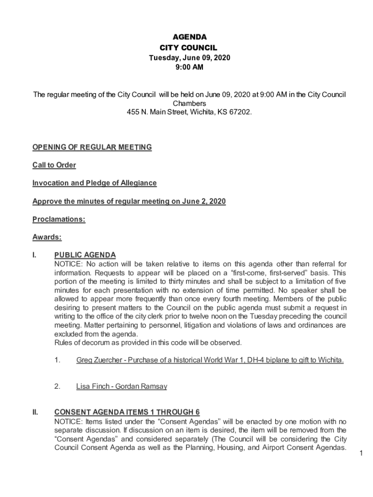 AGENDA CITY COUNCIL Tuesday, June 09, 2020 9:00 AMT he is regular meeting of the City Council will be held on June 09, 2020, at 9:00 AM in the City Council Chambers 455 N. Main Street, Wichita, KS