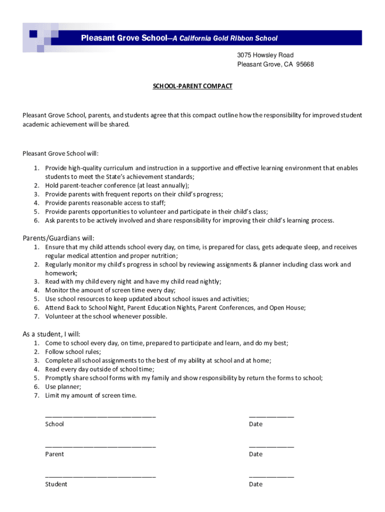 Pleasant Grove Schools California Gold Ribbon School 3075 Mosley Road Pleasant Grove, CA 95668SCHOOLPARENT COMPACTPleasant Grove School, parents, and students agree that this compact outline how the