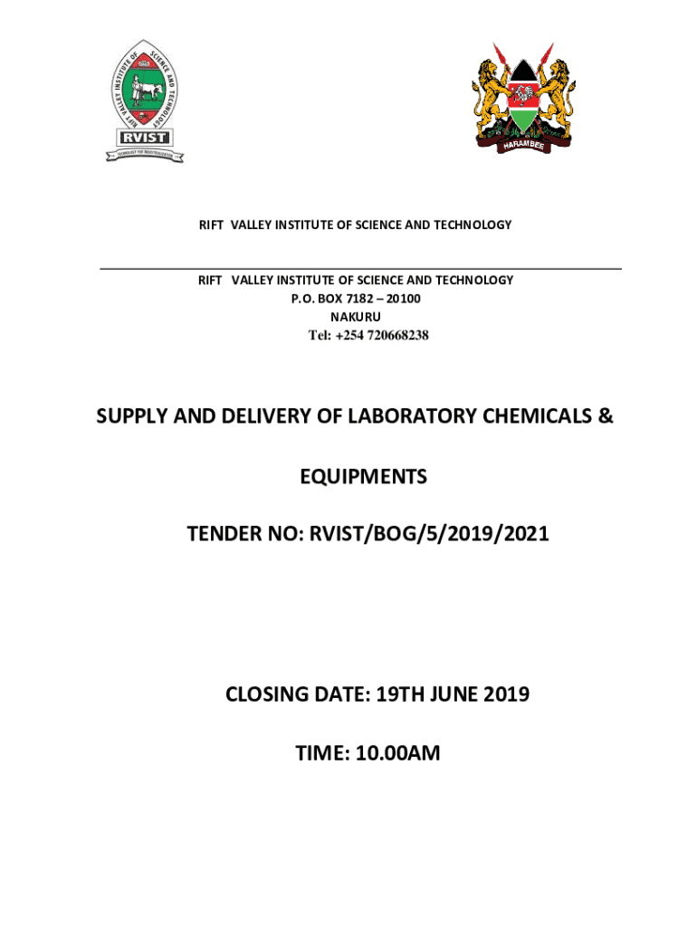 RIFT VALLEY INSTITUTE OF SCIENCE AND TECHNOLOGIST VALLEY INSTITUTE OF SCIENCE AND TECHNOLOGY P.O. BOX 7182 20100 NAURU Tel: +254 720668238SUPPLY AND DELIVERY OF LABORATORY CHEMICALS & EQUIPMENTS TENDER