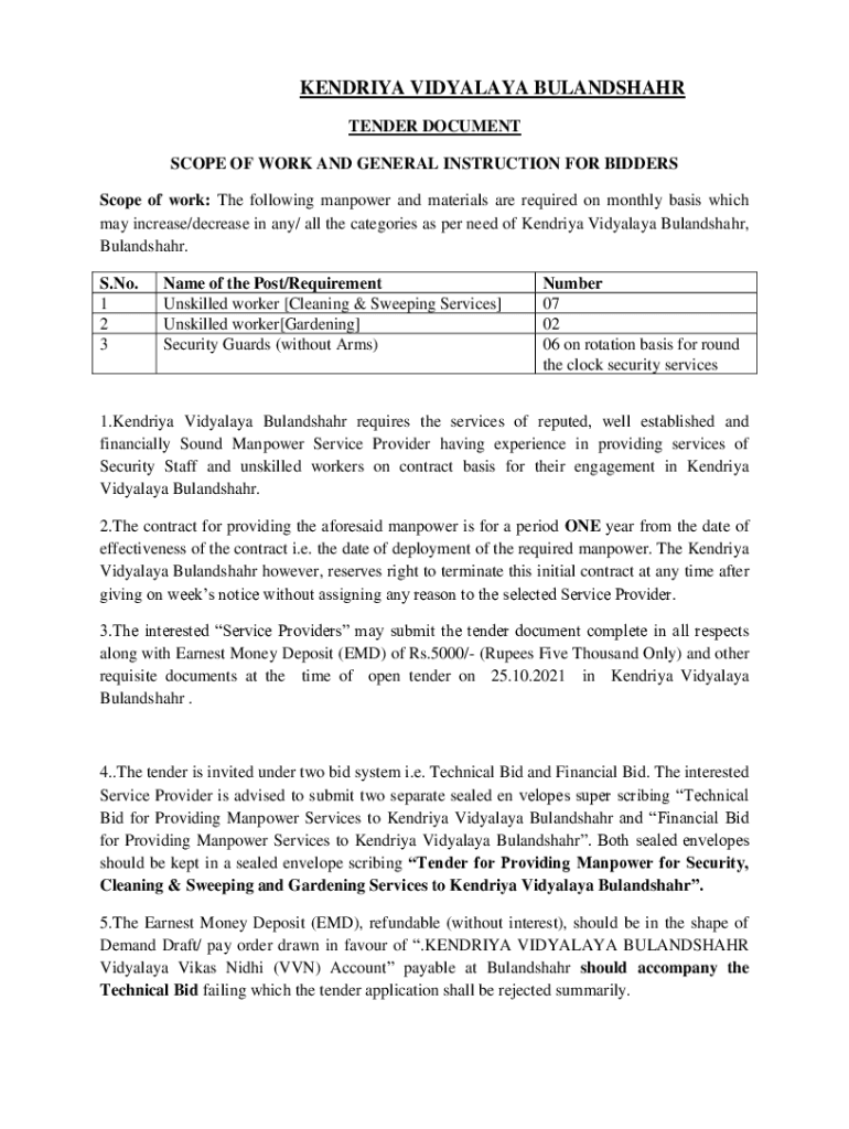 KENDRA HIMALAYA BULANDSHAHR TENDER DOCUMENT SCOPE OF WORK AND GENERAL INSTRUCTION FOR BIDDERS Scope of work: The following manpower and materials are required on monthly basis which may increase/decrease