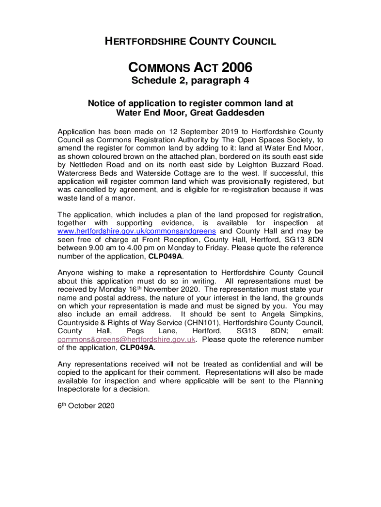 HERTFORDSHIRE COUNTY COUNCILCOMMONS ACT 2006 Schedule 2, paragraph 4 Notice of application to register common land at Water End Moor, Great Gadsden Application has been made on 12 September 2019 to