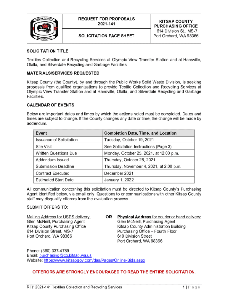 REQUEST FOR PROPOSALS 2021141 SOLICITATION FACE SHEETKITSAP COUNTY PURCHASING OFFICE 614 Division St., MS7 Port Orchard, WA 98366SOLICITATION TITLE Textiles Collection and Recycling Services at Olympic