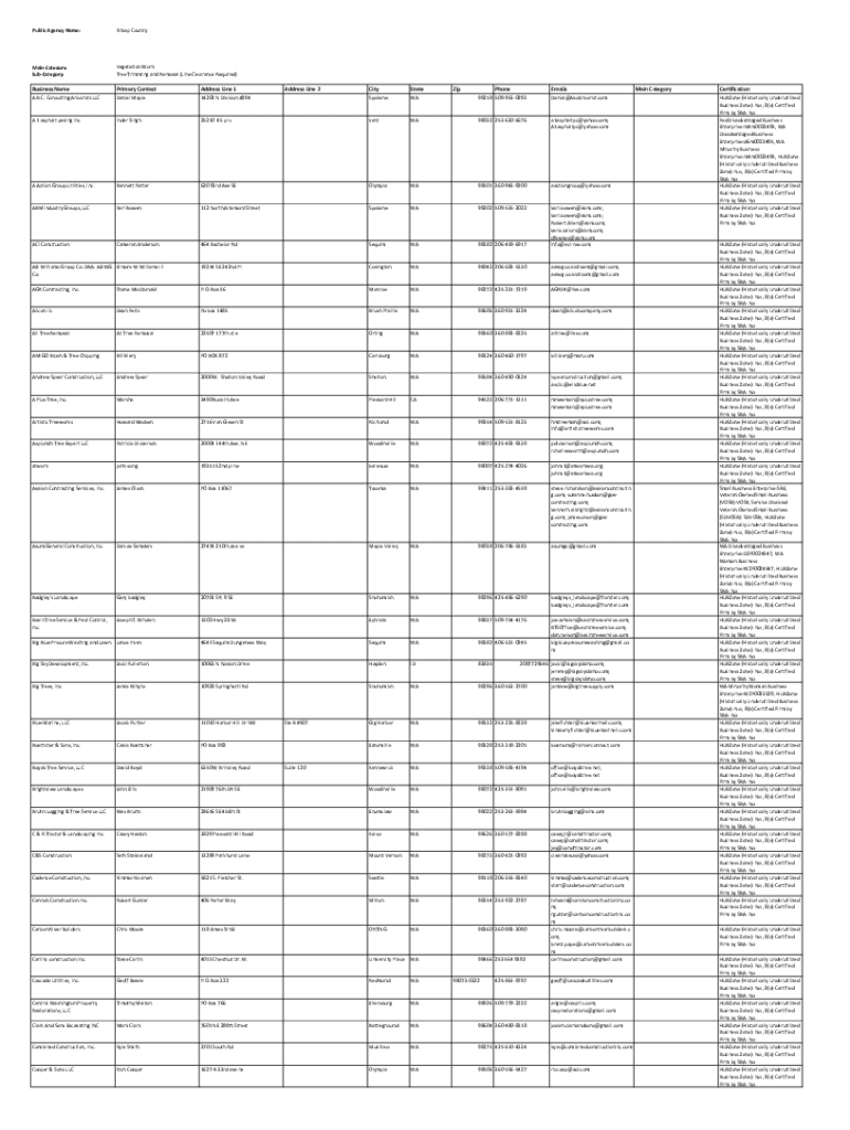 Public Agency Name:Kit sap CountyMainCategory: Subcategory:Vegetation Work Tree Trimming and Removal (Line Clearance Required)Business Preprimary ContactAddress Line 1CityStateA. B.C. Consulting Arborists
