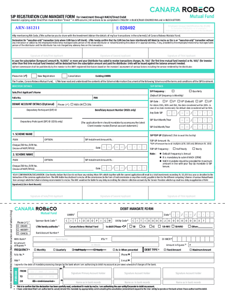 SIP REGISTRATION Come MANDATE Former investment through EACH/Direct Debit(Investors applying under Direct Plan must mention Direct in ARN column.) All sections to be completed in ENGLISH in BLACK/BLUE