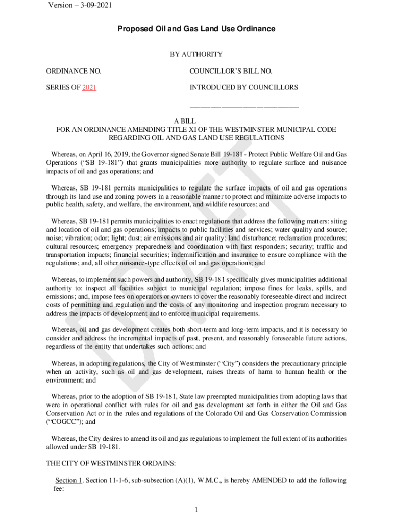Version 3092021 Proposed Oil and Gas Land Use Ordinance BY AUTHORITY ORDINANCE NO.COUNCILLORS BILL NO.SERIES OF 2021INTRODUCED BY COUNCILLORS ___A BILL FOR AN ORDINANCE AMENDING TITLE XI OF THE WESTMINSTER