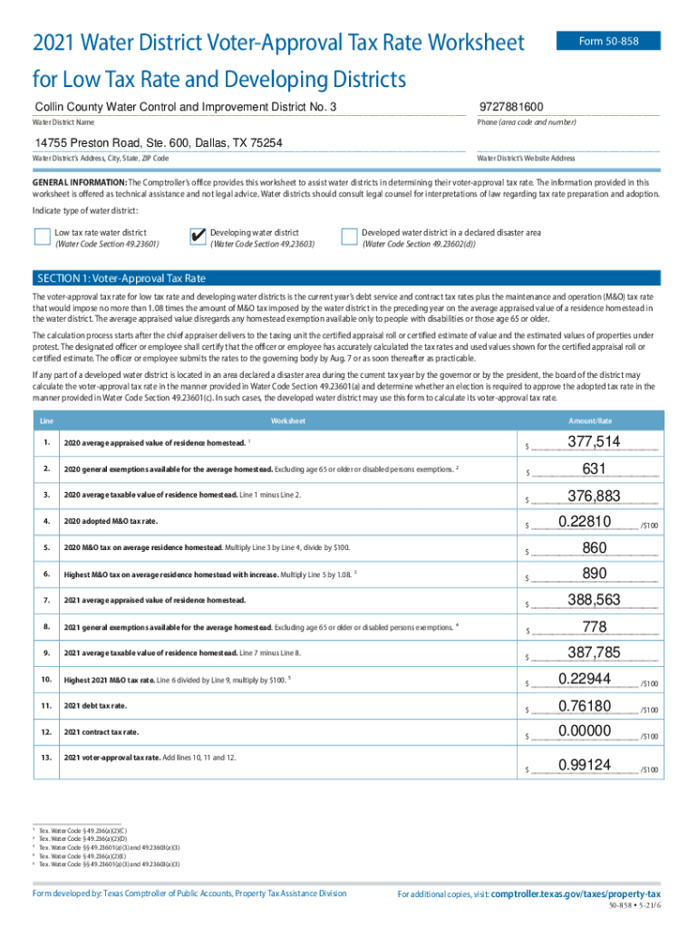 2021 Water District VoterApproval Tax Rate WorksheetForm 50858for Low Tax Rate and Developing Districts Collin County Water Control and Improvement District No. 3 ___ Water District Name9727881600