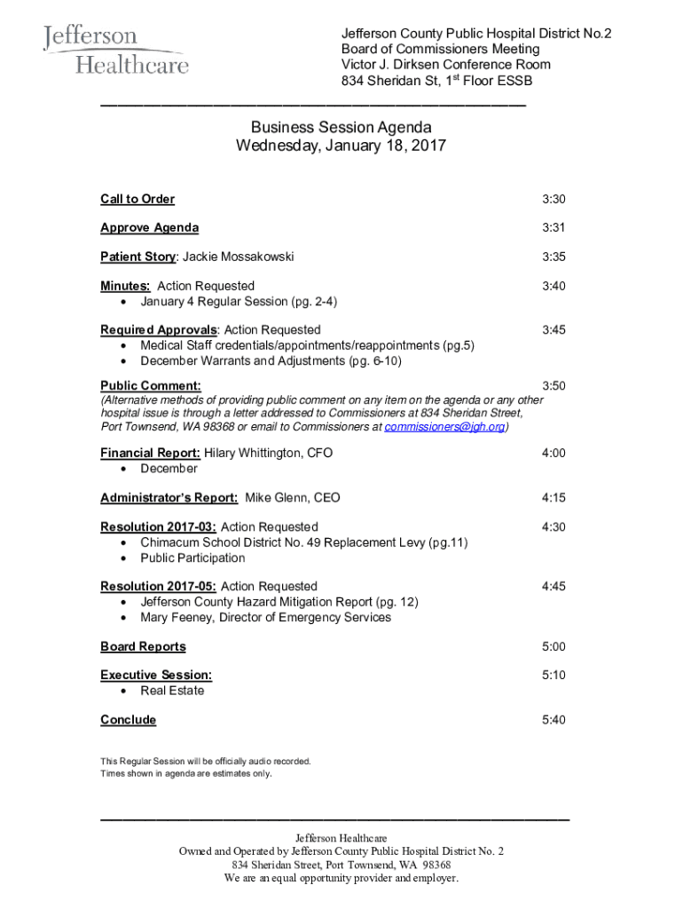 Jefferson County Public Hospital District No.2 Board of Commissioners Meeting Victor J. Dirk sen Conference Room 834 Sheridan St, 1st Floor ESB___ Business Session Agenda Wednesday, January 18, 2017,