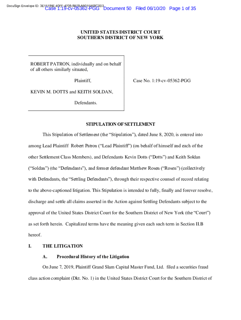 DocuSign Envelope ID: 3E15185E40FF47088B78AB015A68C0D3Case 1:19cv05362PGG Document 50 Filed 06/10/20-Page 1 of 35UNITED STATES DISTRICT COURT SOUTHERN DISTRICT OF NEW YORKROBERT PATRON, individually