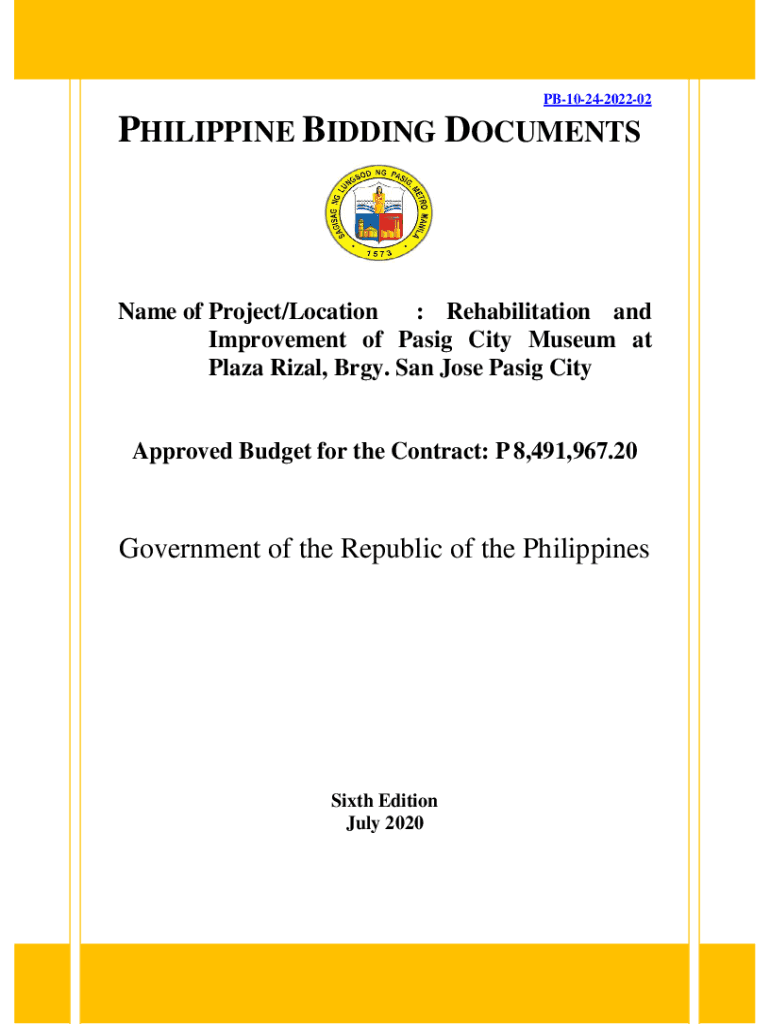 PB1024202202PHILIPPINE BIDDING DOCUMENTSName of Project/Location : Rehabilitation and Improvement of PSIG City Museum at Plaza Rizal, Bray. San Jose PSIG Disapproved Budget for the Contract: P 8,491,967.20Government