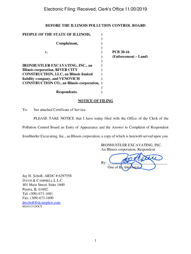 Electronic Filing: Received, Clerk\'s Office 11/20/2019BEFORE THE ILLINOIS POLLUTION CONTROL BOARD PEOPLE OF THE STATE OF ILLINOIS, ) ) Complainant,) ) v.) )) IRONHUSTLER EXCAVATING, INC., an) Illinois