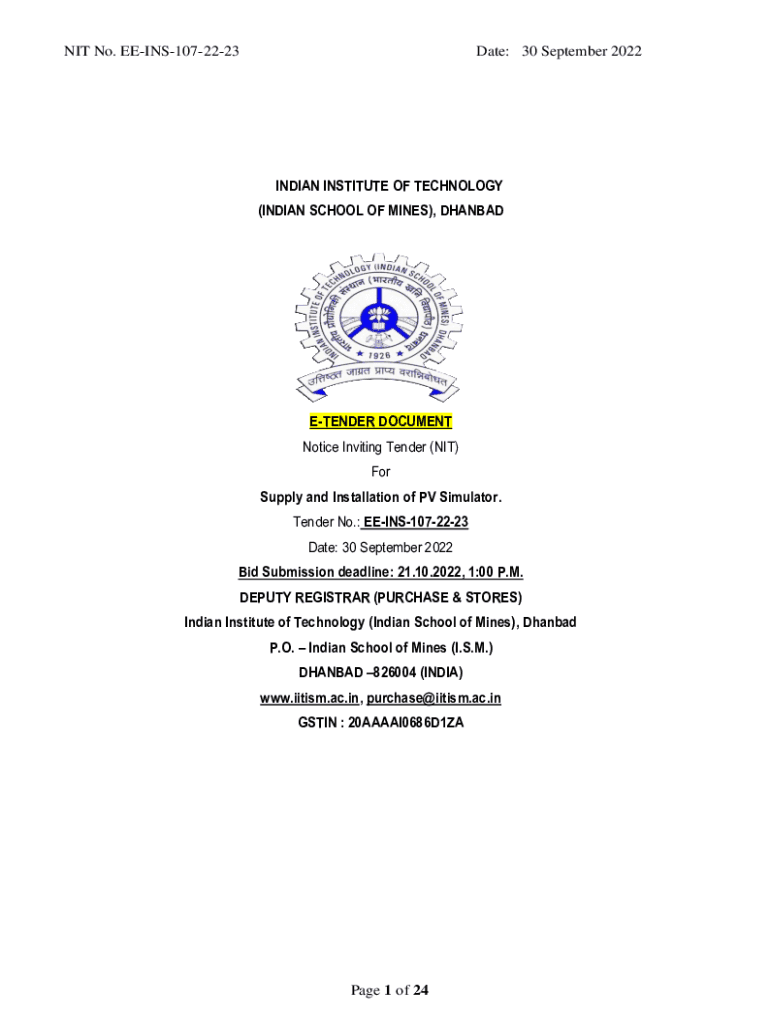 NIT No. EEINS1072223Date: 30 September 2022INDIAN INSTITUTE OF TECHNOLOGY (INDIAN SCHOOL OF MINES), DHANBADETENDER DOCUMENT Notice Inviting Tender (NIT) For Supply and Installation of PV Simulator.