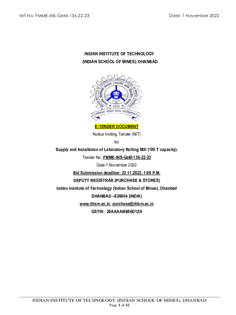 NIT No. FMMEINSGeM1362223Date: 1 November 2022INDIAN INSTITUTE OF TECHNOLOGY (INDIAN SCHOOL OF MINES), DHANBADETENDER DOCUMENT Notice Inviting Tender (NIT) for Supply and Installation of Laboratory