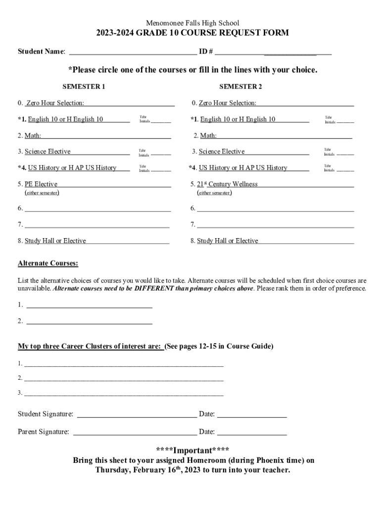 Menomonee Falls High School20232024 GRADE 10 COURSE REQUEST FORM Student Name:ID #___*Please circle one of the courses or fill in the lines with your choice. SEMESTER 1SEMESTER 20. Zero Hour Selection: