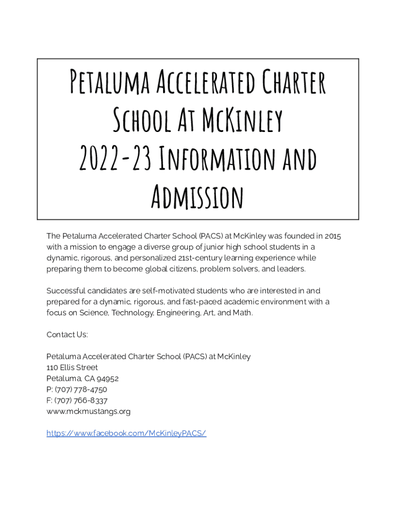 Petaluma Accelerated Charter School At McKinley 202223 Information and Admission The Petaluma Accelerated Charter School (PACS) at McKinley was founded in 2015 with a mission to engage a diverse group