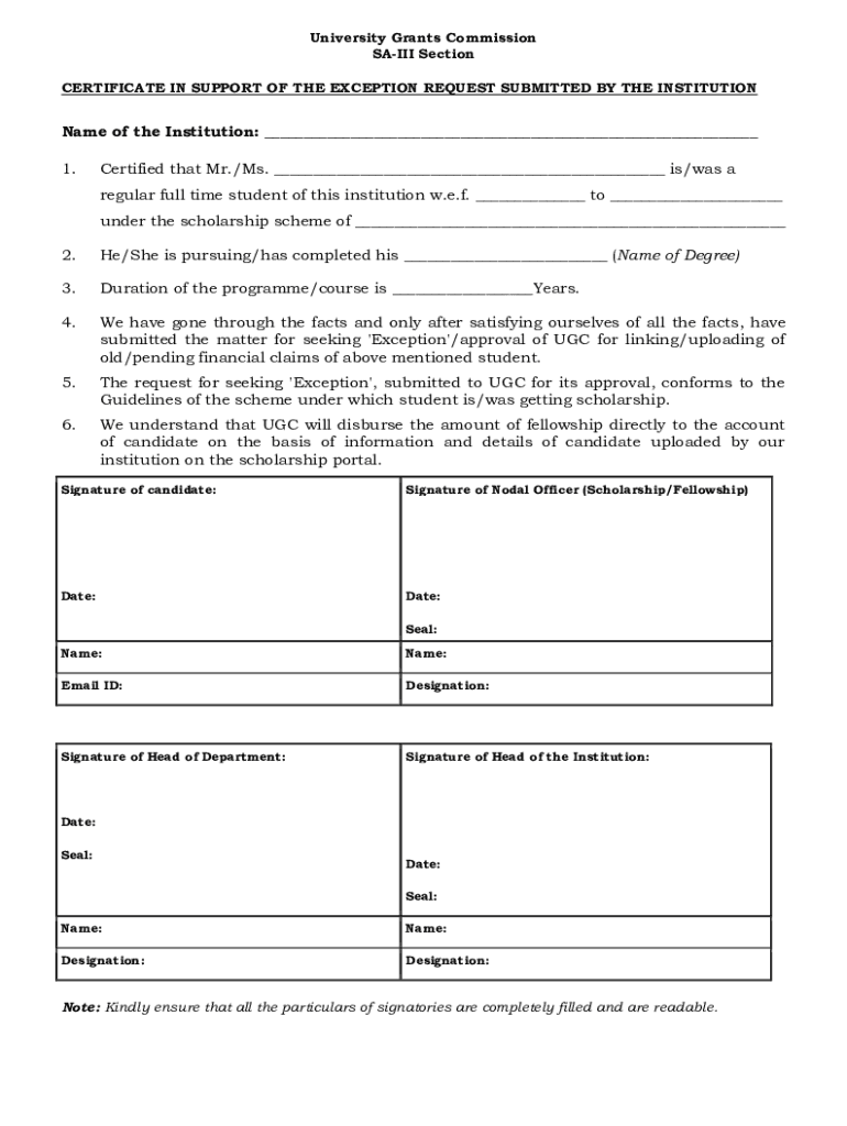 University Grants Commission SAID Section CERTIFICATE IN SUPPORT OF THE EXCEPTION REQUEST SUBMITTED BY THE Institutional of the Institution: ___ 1. Certified that Mr./Ms. ___ is/was a regular full