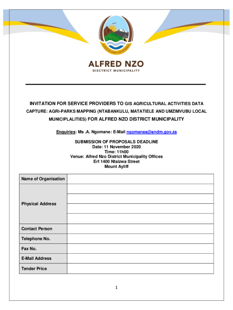 INVITATION FOR SERVICE PROVIDERS TO GIS AGRICULTURAL ACTIVITIES DATA CAPTURE: AIRPARKS MAPPING (NTABANKULU, MATERIEL AND UMZIMVUBU LOCAL MUNICIPALITIES) FOR ALFRED NO DISTRICT MUNICIPALITY Inquiries: