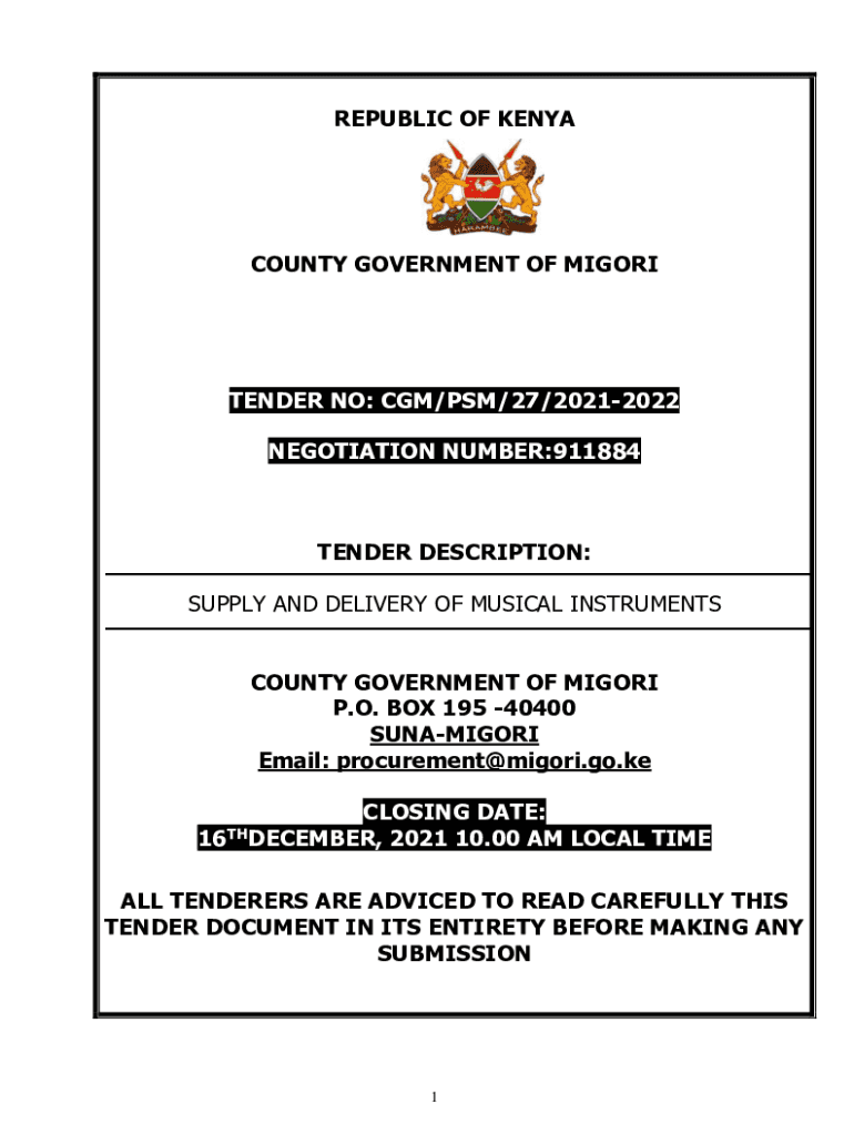 REPUBLIC OF KENYACOUNTY GOVERNMENT OF MIGORITENDER NO: CGM/PSM/27/20212022 NEGOTIATION NUMBER:911884TENDER DESCRIPTION: SUPPLY AND DELIVERY OF MUSICAL INSTRUMENTS COUNTY GOVERNMENT OF MIG ORI P.O.