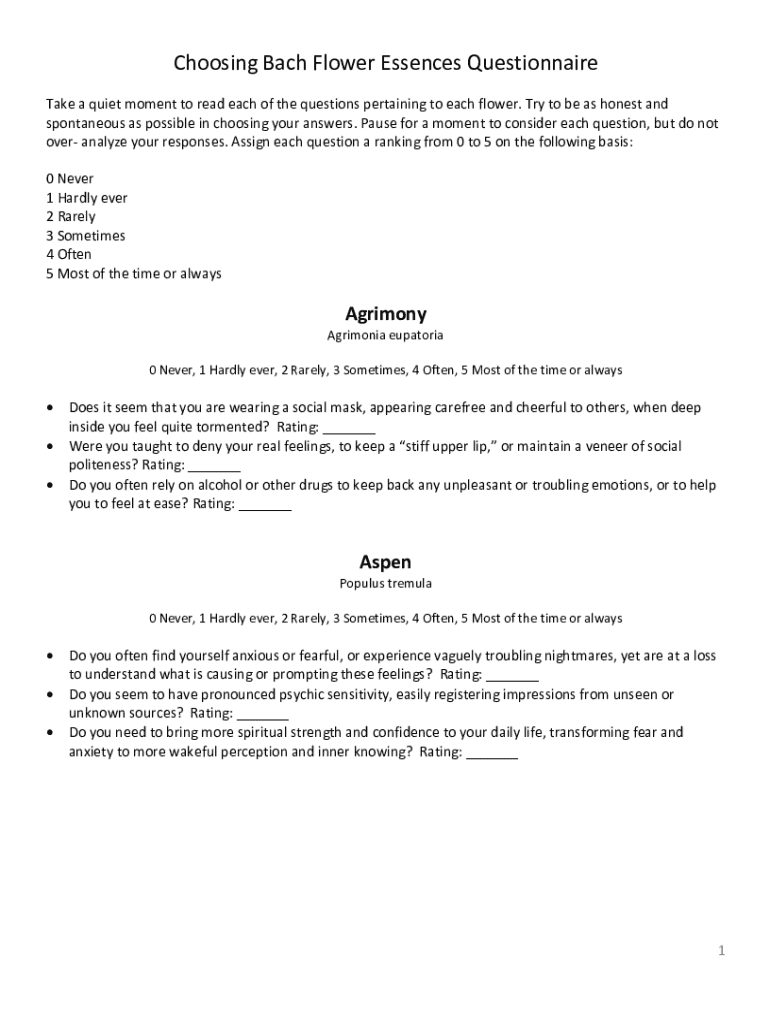 Choosing Bach Flower Essences Questionnaire Take a quiet moment to read each of the questions pertaining to each flower. Try to be as honest and spontaneous as possible in choosing your answers. Pause