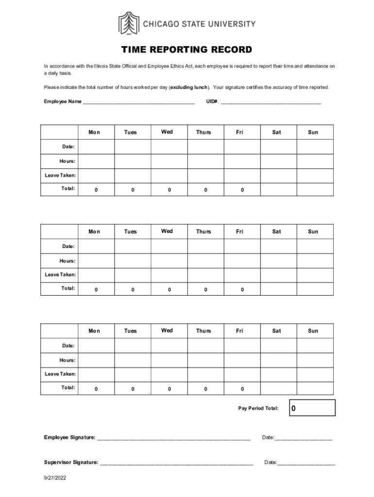 TIME REPORTING RECORD In accordance with the Illinois State Official and Employee Ethics Act, each employee is required to report their time and attendance on a daily basis. Please indicate the total